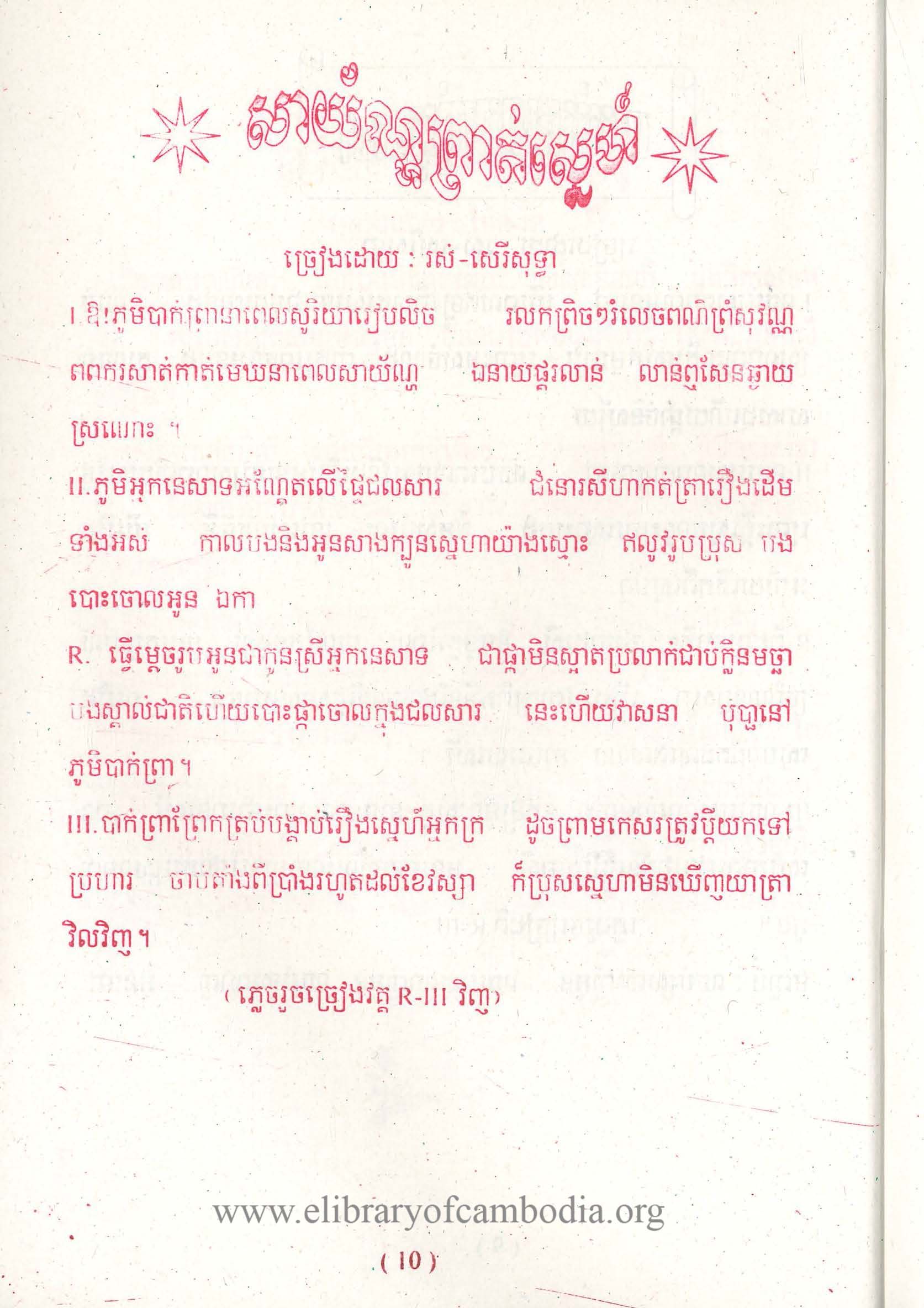 - យើងមានអត្ថបទ ដកស្រង់ចេញពីសៀវភៅ ចំរៀងជ្រើសរើសពិសេស រស សេរីសុទ្ធា ទំព័រទី១០