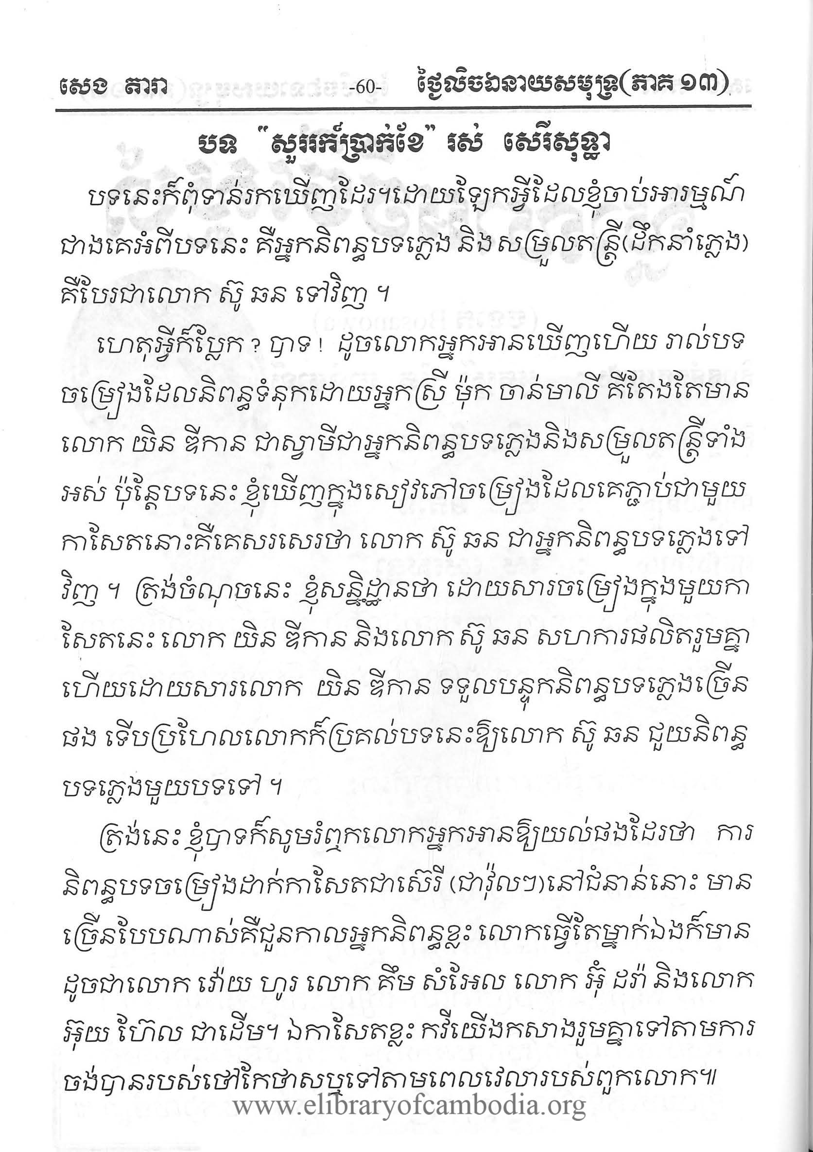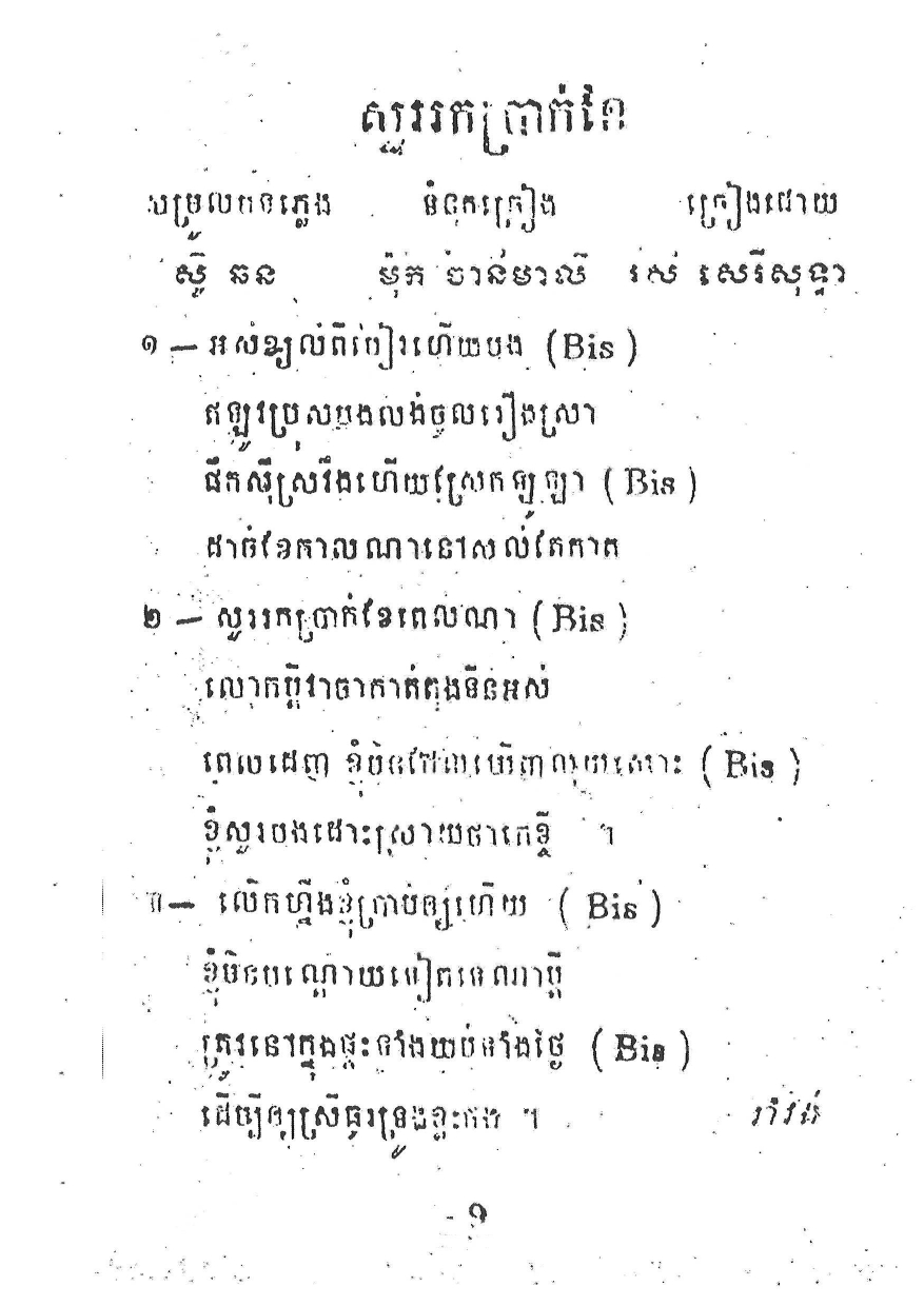 យើងខ្ញុំមានបំណងរក្សាសម្បត្តិខ្មែរទុកនៅលើគេហទំព័រ www.elibraryofcambodia.org នេះ ព្រមទាំងផ្សព្វផ្សាយសម្រាប់បម្រើជាប្រយោជន៍សាធារណៈ ដោយឥតគិតរក និងយកកម្រៃ នៅមុនថ្ងៃទី១៧ ខែមេសា ឆ្នាំ១៩៧៥ ចម្រៀងខ្មែរបានថតផ្សាយលក់លើថាសចម្រៀង 45 RPM 33 ½ RPM 78 RPM ដោយផលិតកម្ម ថាស កណ្ដឹងមាស ឃ្លាំងមឿង ចតុមុខ ហេងហេង សញ្ញាច័ន្ទឆាយា នាគមាស បាយ័ន ផ្សារថ្មី ពស់មាស ពែងមាស ភួងម្លិះ ភ្នំពេជ្រ គ្លិស្សេ ភ្នំពេញ ភ្នំមាស មណ្ឌលតន្រ្តី មនោរម្យ មេអំបៅ រូបតោ កាពីតូល សញ្ញា វត្តភ្នំ វិមានឯករាជ្យ សម័យអាប៉ូឡូ សាឃូរ៉ា ខ្លាធំ សិម្ពលី សេកមាស ហង្សមាស ហនុមាន ហ្គាណេហ្វូ អង្គរ Lac Sea សញ្ញា អប្សារា អូឡាំពិក កីឡា ថាសមាស ម្កុដពេជ្រ មនោរម្យ បូកគោ ឥន្ទ្រី Eagle ទេពអប្សរ ចតុមុខ ឃ្លោកទិព្វ ខេមរា មេខ្លា សាកលតន្ត្រី មេអំបៅ Diamond Columbo ហ្វីលិព Philips EUROPASIE EP ដំណើរខ្មែរ ទេពធីតា មហាធូរ៉ា ជាដើម។