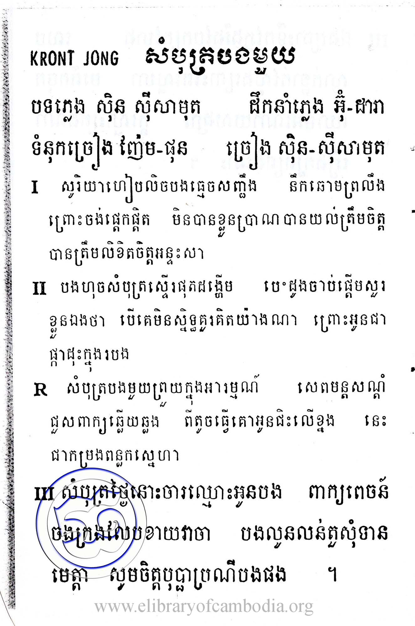 - សំបុត្របងមួយ ជាបទចម្រៀងដើម មុនថ្ងៃ១៧ មេសា ១៩៧៥ ច្រៀងដំបូង ដោយ សុីន ស៊ីសាមុត