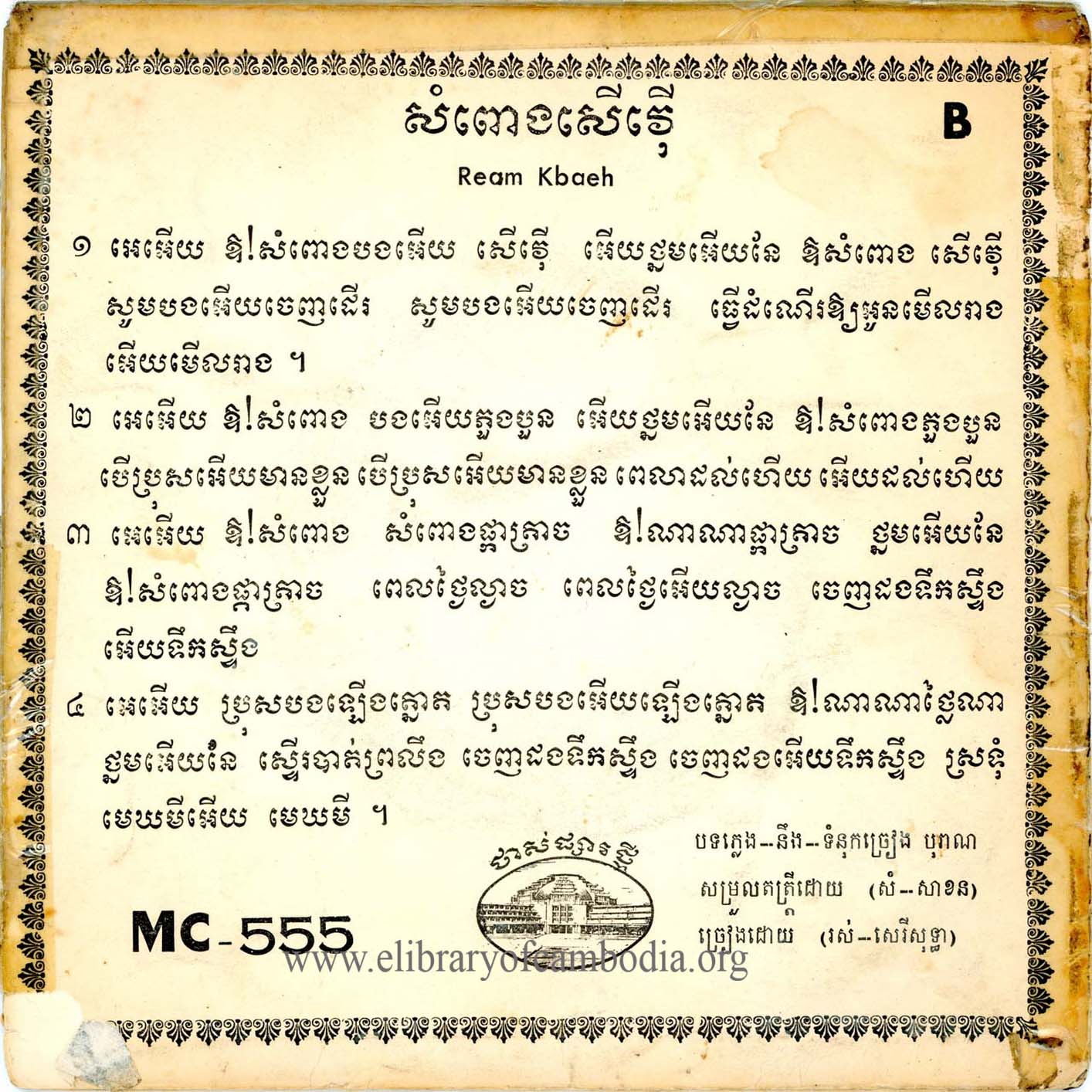 យើងខ្ញុំមានបំណងរក្សាសម្បត្តិខ្មែរទុកនៅលើគេហទំព័រ www.elibraryofcambodia.org នេះ ព្រមទាំងផ្សព្វផ្សាយសម្រាប់បម្រើជាប្រយោជន៍សាធារណៈ ដោយឥតគិតរក និងយកកម្រៃ នៅមុនថ្ងៃទី១៧ ខែមេសា ឆ្នាំ១៩៧៥ ចម្រៀងខ្មែរបានថតផ្សាយលក់លើថាសចម្រៀង 45 RPM 33 ½ RPM 78 RPM ដោយផលិតកម្ម ថាស កណ្ដឹងមាស ឃ្លាំងមឿង ចតុមុខ ហេងហេង សញ្ញាច័ន្ទឆាយា នាគមាស បាយ័ន ផ្សារថ្មី ពស់មាស ពែងមាស ភួងម្លិះ ភ្នំពេជ្រ គ្លិស្សេ ភ្នំពេញ ភ្នំមាស មណ្ឌលតន្រ្តី មនោរម្យ មេអំបៅ រូបតោ កាពីតូល សញ្ញា វត្តភ្នំ វិមានឯករាជ្យ សម័យអាប៉ូឡូ សាឃូរ៉ា ខ្លាធំ សិម្ពលី សេកមាស ហង្សមាស ហនុមាន ហ្គាណេហ្វូ អង្គរ Lac Sea សញ្ញា អប្សារា អូឡាំពិក កីឡា ថាសមាស ម្កុដពេជ្រ មនោរម្យ បូកគោ ឥន្ទ្រី Eagle ទេពអប្សរ ចតុមុខ ឃ្លោកទិព្វ ខេមរា មេខ្លា សាកលតន្ត្រី មេអំបៅ Diamond Columbo ហ្វីលិព Philips EUROPASIE EP ដំណើរខ្មែរ ទេពធីតា មហាធូរ៉ា ជាដើម។