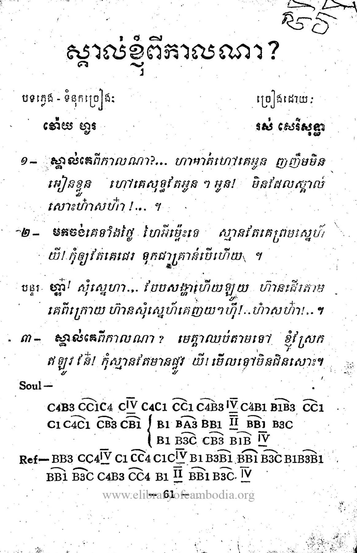 - ចេញផ្សាយនៅលើសៀវភៅ វ៉ោយ ហូរ លេខ១ - ស្គាល់ខ្ញុំពីកាលណា? - ទំព័រ ៦១ មាន Music score
