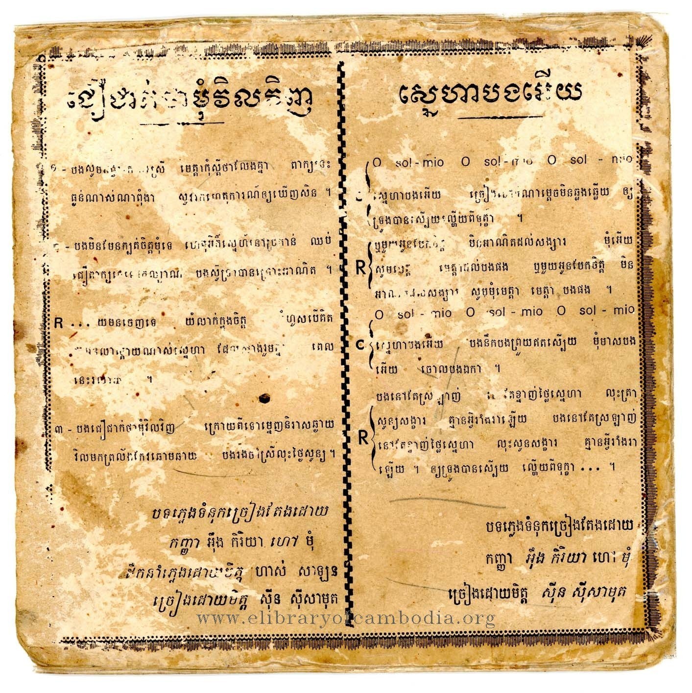 យើងខ្ញុំមានបំណងរក្សាសម្បត្តិខ្មែរទុកនៅលើគេហទំព័រ www.elibraryofcambodia.org នេះ ព្រមទាំងផ្សព្វផ្សាយសម្រាប់បម្រើជាប្រយោជន៍សាធារណៈ ដោយឥតគិតរក និងយកកម្រៃ នៅមុនថ្ងៃទី១៧ ខែមេសា ឆ្នាំ១៩៧៥ ចម្រៀងខ្មែរបានថតផ្សាយលក់លើថាសចម្រៀង 45 RPM 33 ½ RPM 78 RPM ដោយផលិតកម្ម ថាស កណ្ដឹងមាស ឃ្លាំងមឿង ចតុមុខ ហេងហេង សញ្ញាច័ន្ទឆាយា នាគមាស បាយ័ន ផ្សារថ្មី ពស់មាស ពែងមាស ភួងម្លិះ ភ្នំពេជ្រ គ្លិស្សេ ភ្នំពេញ ភ្នំមាស មណ្ឌលតន្រ្តី មនោរម្យ មេអំបៅ រូបតោ កាពីតូល សញ្ញា វត្តភ្នំ វិមានឯករាជ្យ សម័យអាប៉ូឡូ សាឃូរ៉ា ខ្លាធំ សិម្ពលី សេកមាស ហង្សមាស ហនុមាន ហ្គាណេហ្វូ អង្គរ Lac Sea សញ្ញា អប្សារា អូឡាំពិក កីឡា ថាសមាស ម្កុដពេជ្រ មនោរម្យ បូកគោ ឥន្ទ្រី Eagle ទេពអប្សរ ចតុមុខ ឃ្លោកទិព្វ ខេមរា មេខ្លា សាកលតន្ត្រី មេអំបៅ Diamond Columbo ហ្វីលិព Philips EUROPASIE EP ដំណើរខ្មែរ ទេពធីតា មហាធូរ៉ា ជាដើម។