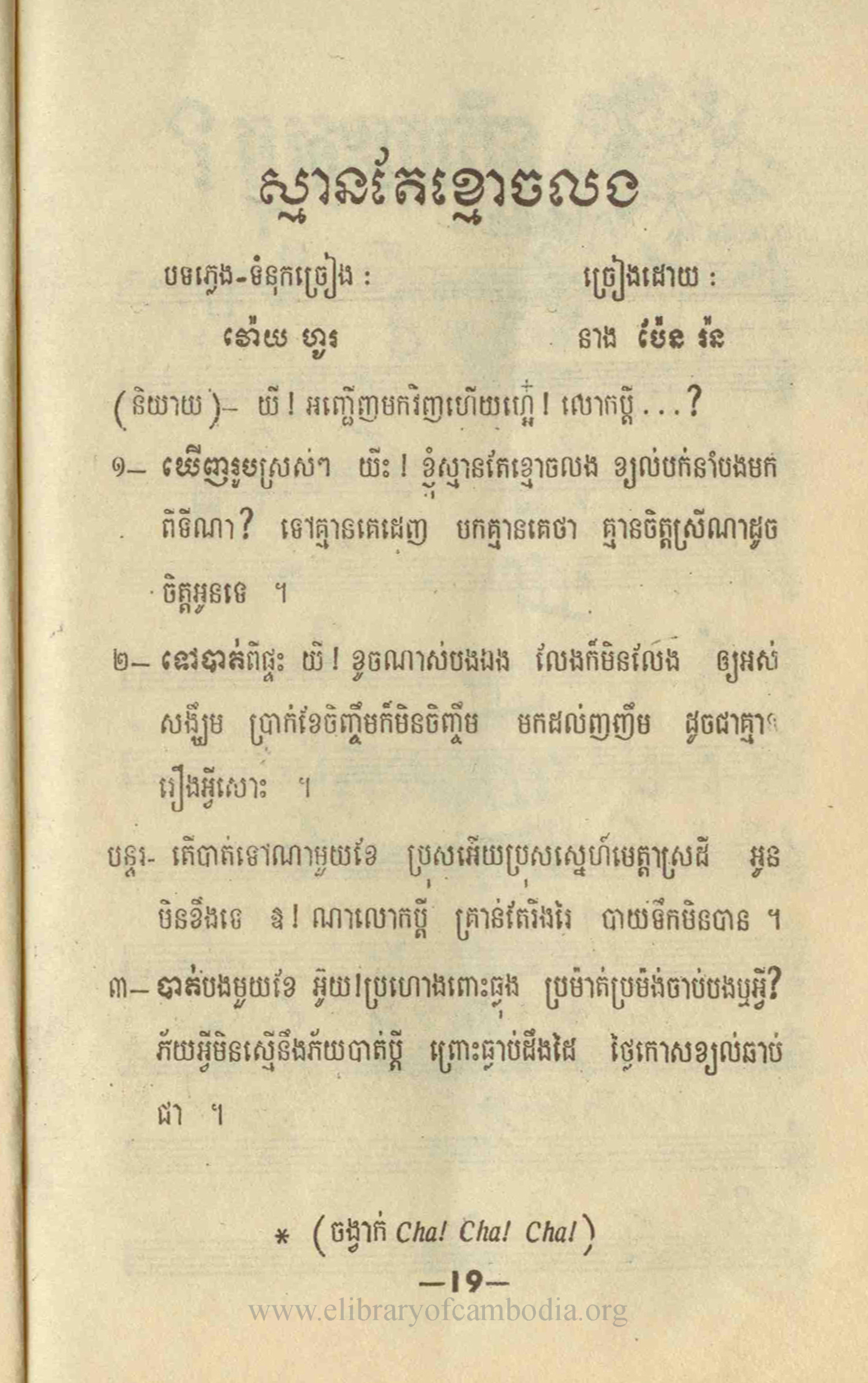 យើងខ្ញុំមានបំណងរក្សាសម្បត្តិខ្មែរទុកនៅលើគេហទំព័រ www.elibraryofcambodia.org នេះ ព្រមទាំងផ្សព្វផ្សាយសម្រាប់បម្រើជាប្រយោជន៍សាធារណៈ ដោយឥតគិតរក និងយកកម្រៃ នៅមុនថ្ងៃទី១៧ ខែមេសា ឆ្នាំ១៩៧៥ ចម្រៀងខ្មែរបានថតផ្សាយលក់លើថាសចម្រៀង 45 RPM 33 ½ RPM 78 RPM​ ដោយផលិតកម្ម ថាស កណ្ដឹងមាស ឃ្លាំងមឿង ចតុមុខ ហេងហេង សញ្ញាច័ន្ទឆាយា នាគមាស បាយ័ន ផ្សារថ្មី ពស់មាស ពែងមាស ភួងម្លិះ ភ្នំពេជ្រ គ្លិស្សេ ភ្នំពេញ ភ្នំមាស មណ្ឌលតន្រ្តី មនោរម្យ មេអំបៅ រូបតោ កាពីតូល សញ្ញា វត្តភ្នំ វិមានឯករាជ្យ សម័យអាប៉ូឡូ ​​​ សាឃូរ៉ា ខ្លាធំ សិម្ពលី សេកមាស ហង្សមាស ហនុមាន ហ្គាណេហ្វូ​ អង្គរ Lac Sea សញ្ញា អប្សារា អូឡាំពិក កីឡា ថាសមាស ម្កុដពេជ្រ មនោរម្យ បូកគោ ឥន្ទ្រី Eagle ទេពអប្សរ ចតុមុខ ឃ្លោកទិព្វ ខេមរា មេខ្លា សាកលតន្ត្រី មេអំបៅ Diamond Columbo ហ្វីលិព Philips EUROPASIE EP ដំណើរខ្មែរ​ ទេពធីតា មហាធូរ៉ា ជាដើម​។