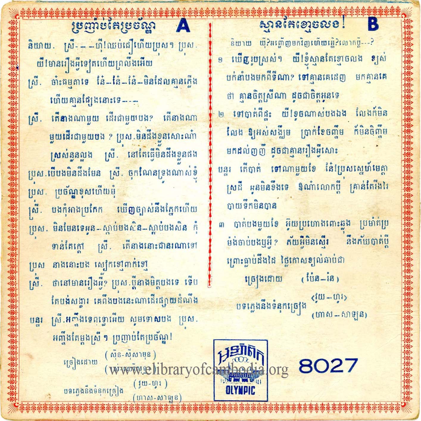បន្ទរ – ដើរបាត់ទៅណាមួយខែ នែ!ប្រុសស្នេហ៍មេត្តាស្រដី អូនមិនខឹងទេឱ!ណាលោកប្ដី គ្រាន់តែរីងរៃបាយទឹកមិនបាន