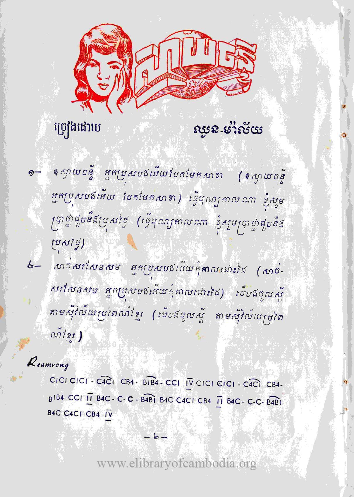 - យើងមានអត្ថបទ និងអក្សរភ្លេង ដកស្រង់ចេញពីសៀវភៅ ចម្រៀងរាំវង់ សំឡេងនាង ម៉ៅ សារេត ទំព័រទី
