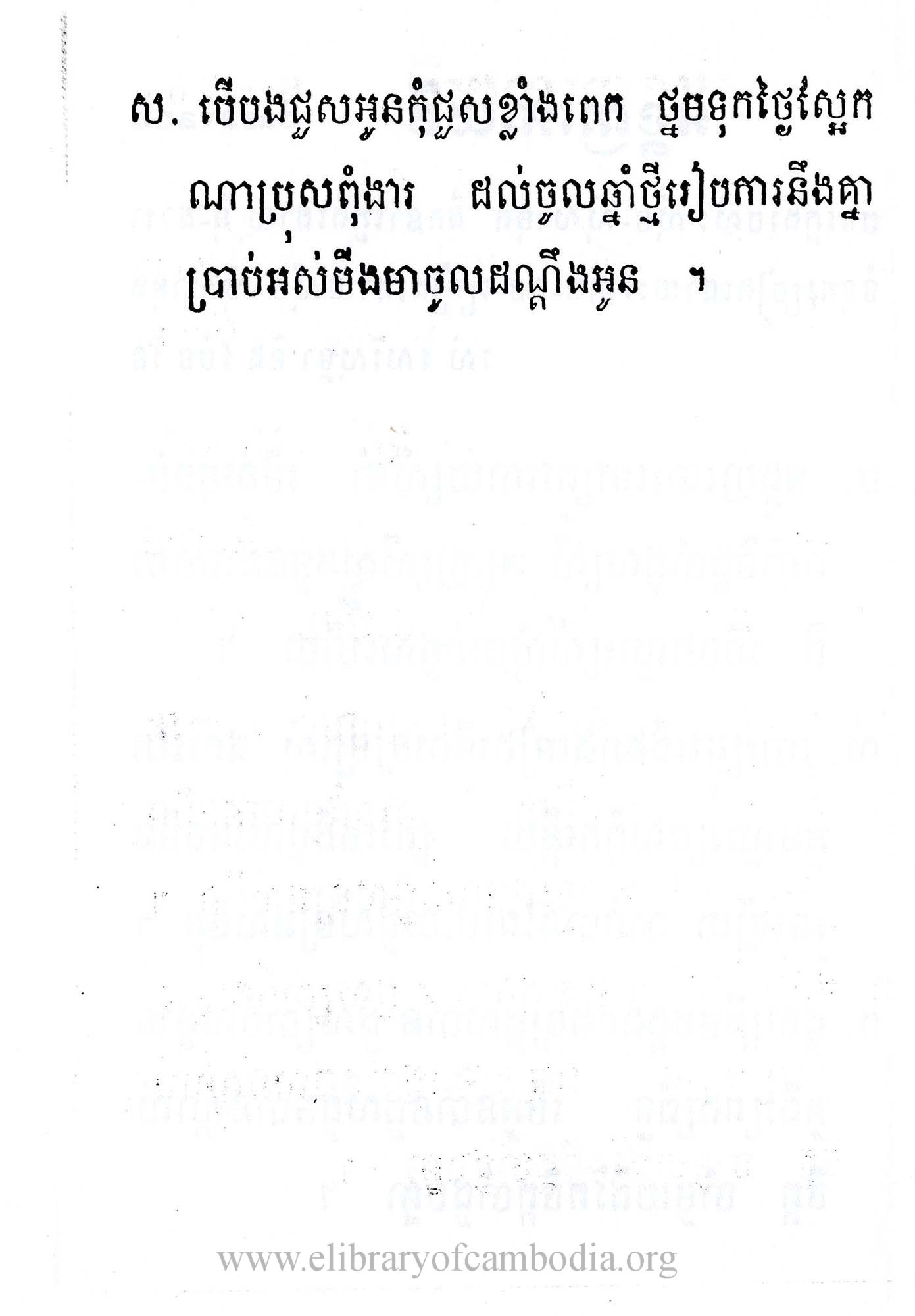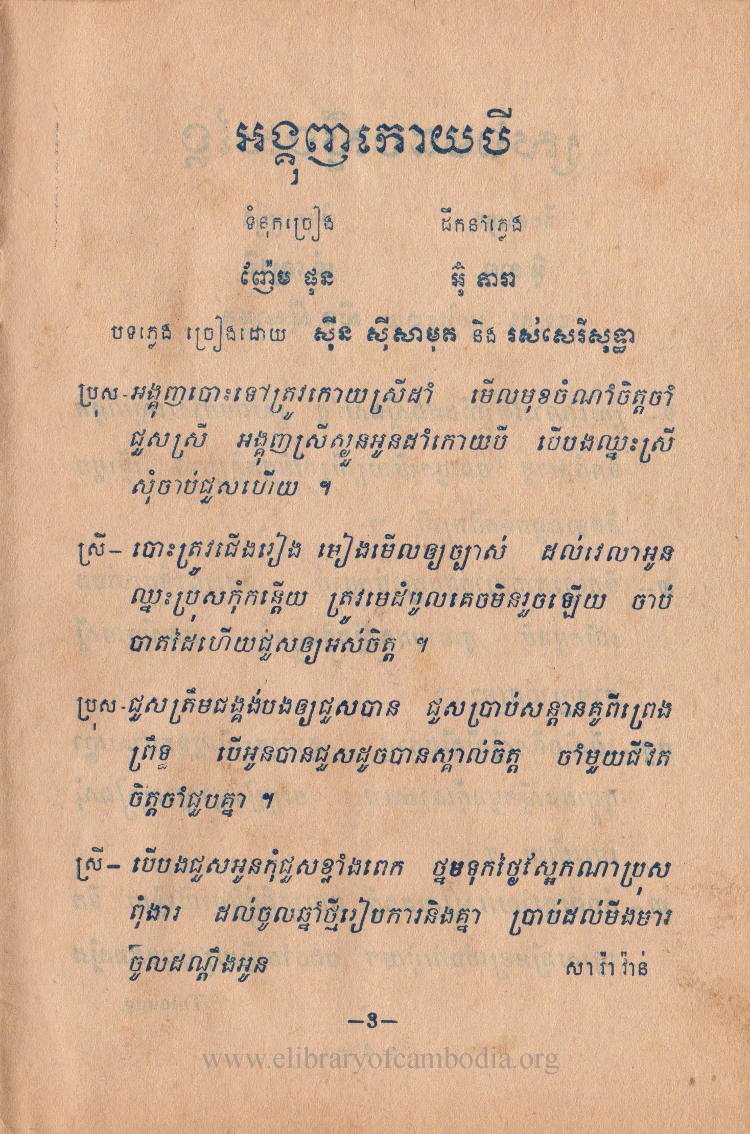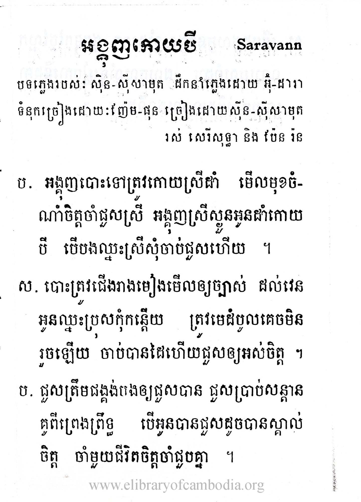 ១ – (ប) អង្គញ់បោះទៅត្រូវកោយស្រីដាំ មើលមុខចំណាំចិត្តចាំជោះស្រី (ពីរដង) អង្គញ់ស្រីស្ងួនអូនដាំកើយបី បើបងឈ្នះស្រីសូមចាប់ជោះហើយ
