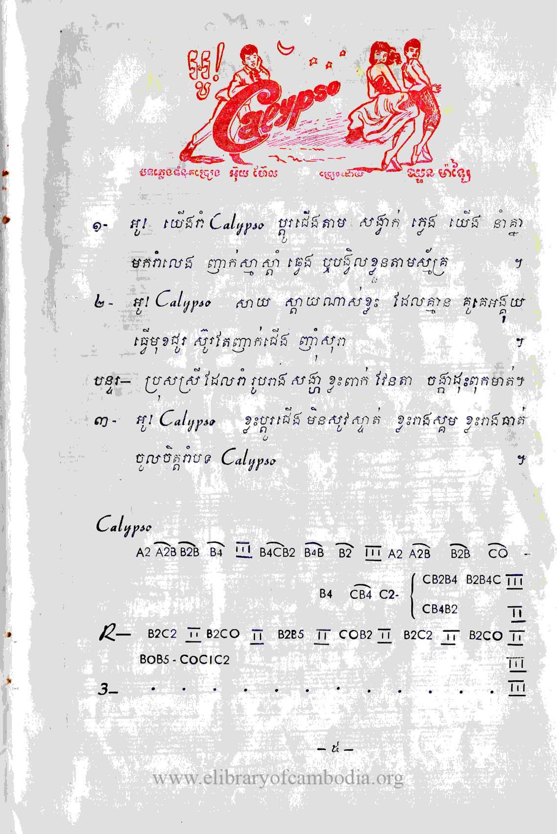 ១ អូ! យើងរាំ Calypso ប្តូរជើងតាម សង្វាក់ ភ្លេង យើងនាំគ្នាមករាំលេង ញាក់ស្មាស្តាំឆ្វេង ឬបង្វិលខ្លួនតាមស្ម័គ្រ ។