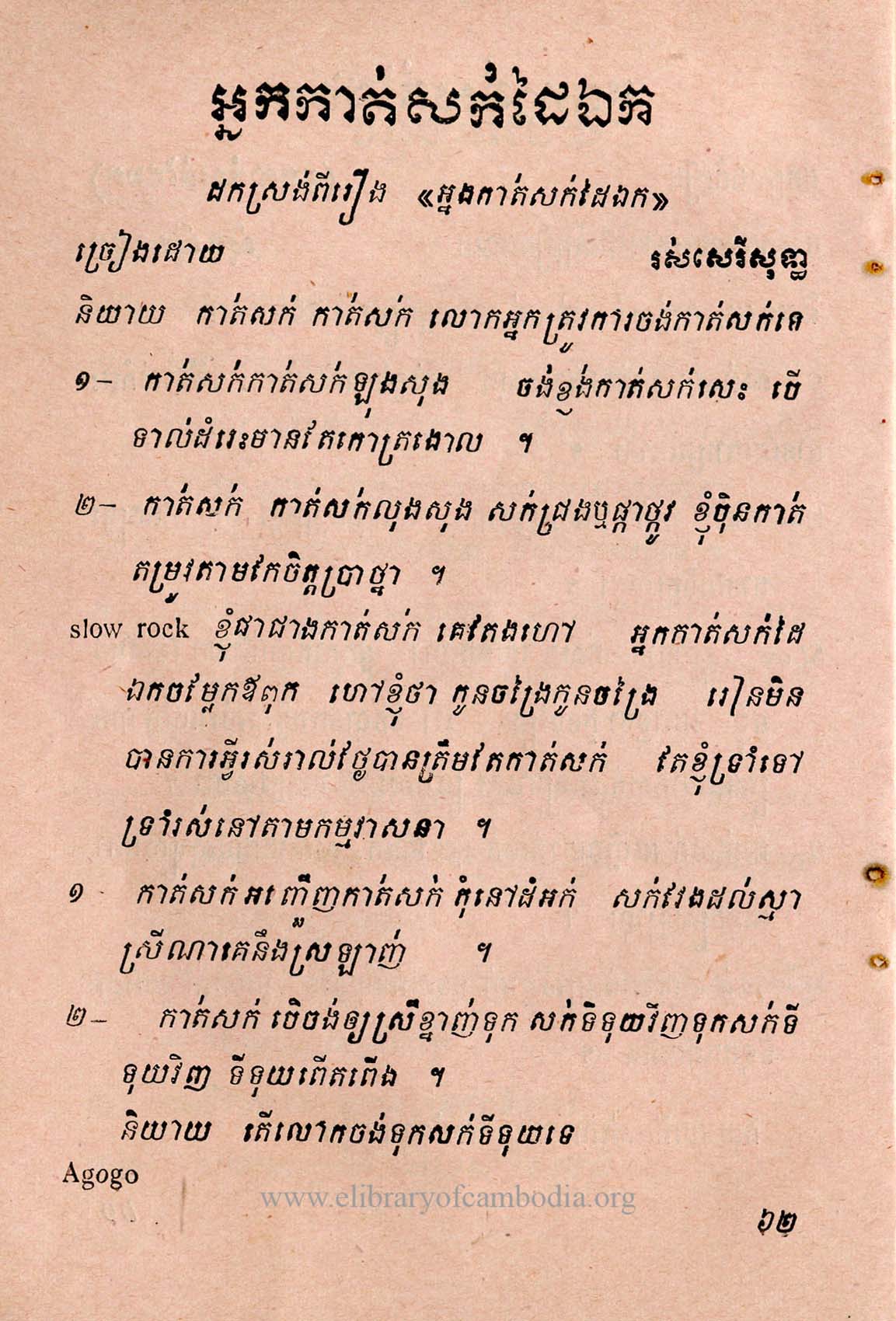 - យើងមានអត្ថបទ ដកស្រង់ចេញពីសៀវភៅ ប្រជុំចំរៀងភាពយន្ត ១៤០បទ ទំព័រទី ៦២
