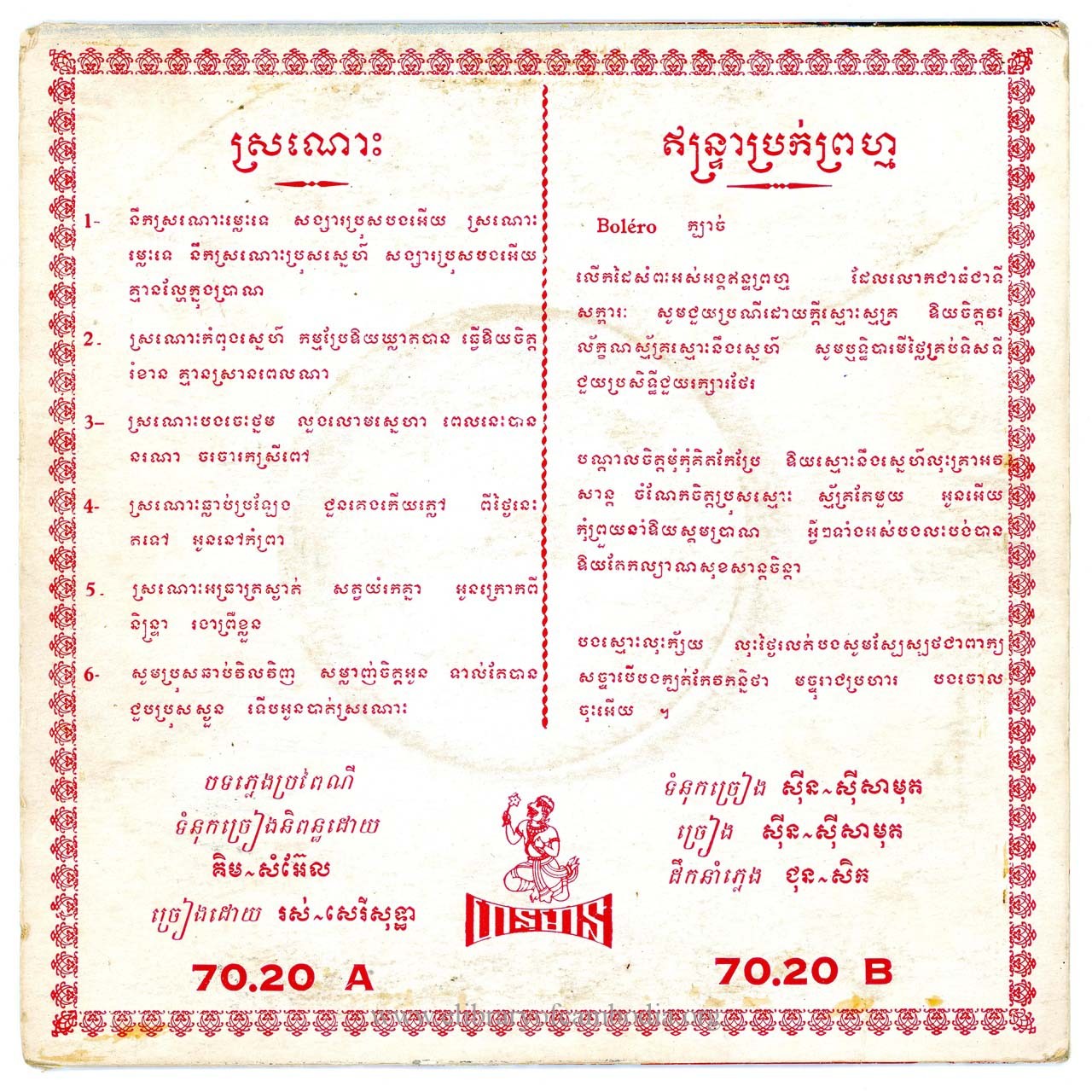 - ចេញផ្សាយជាថាស (Vinyl) ដោយក្រុមហ៊ុន ហនុមាន 45 70-20 B ឥន្រ្ទាប្រក់ព្រហ្ម ថាស