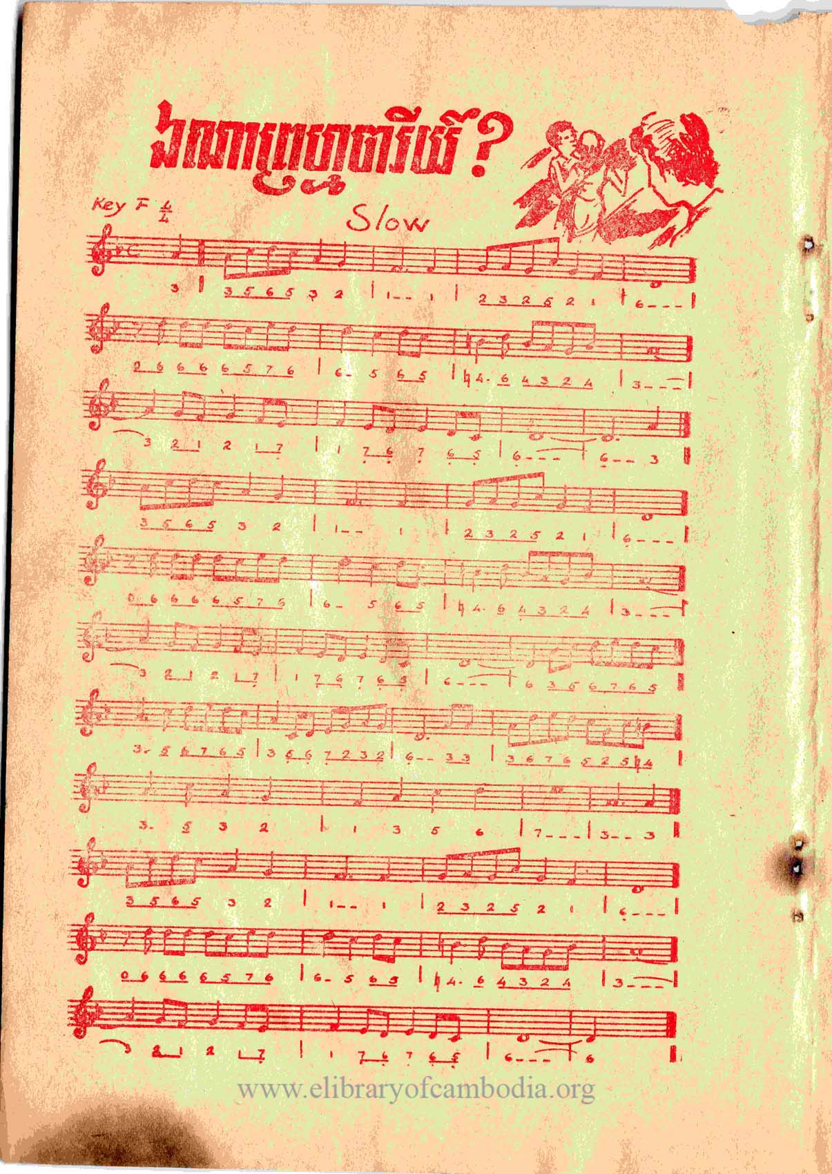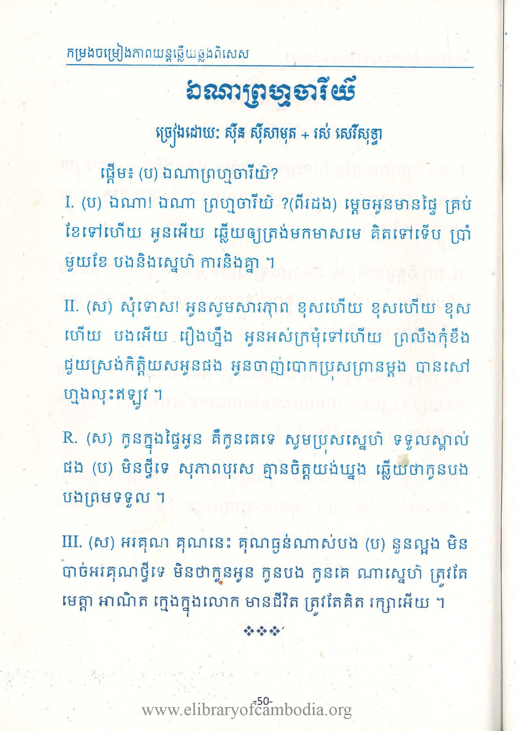 • យើងមានអត្ថបទ និងអក្សរភ្លេង​ ដកស្រង់ចេញពីសៀវភៅ ចំរៀងភាពយន្តឆ្លើយឆ្លងពិសេស ទំព័រ​ ៥០​
