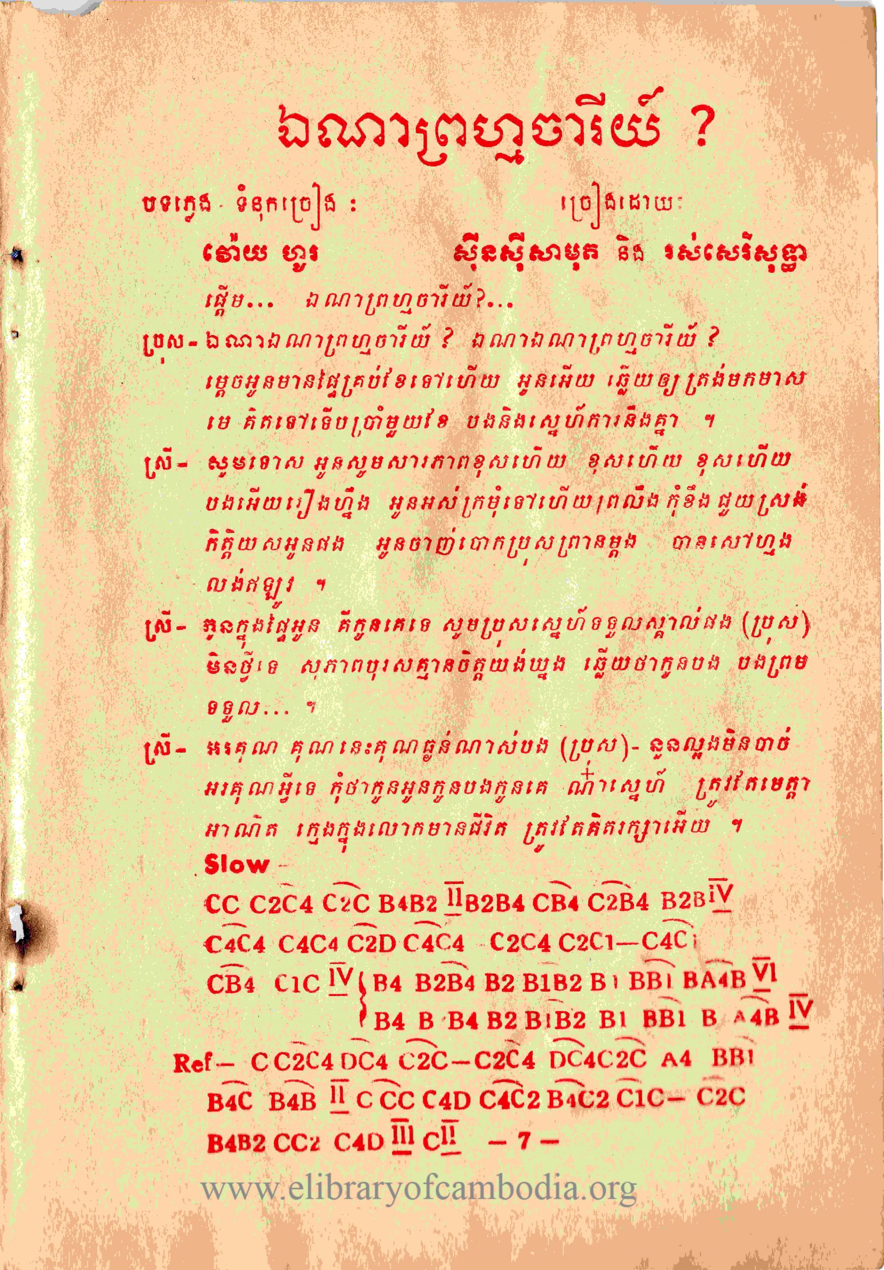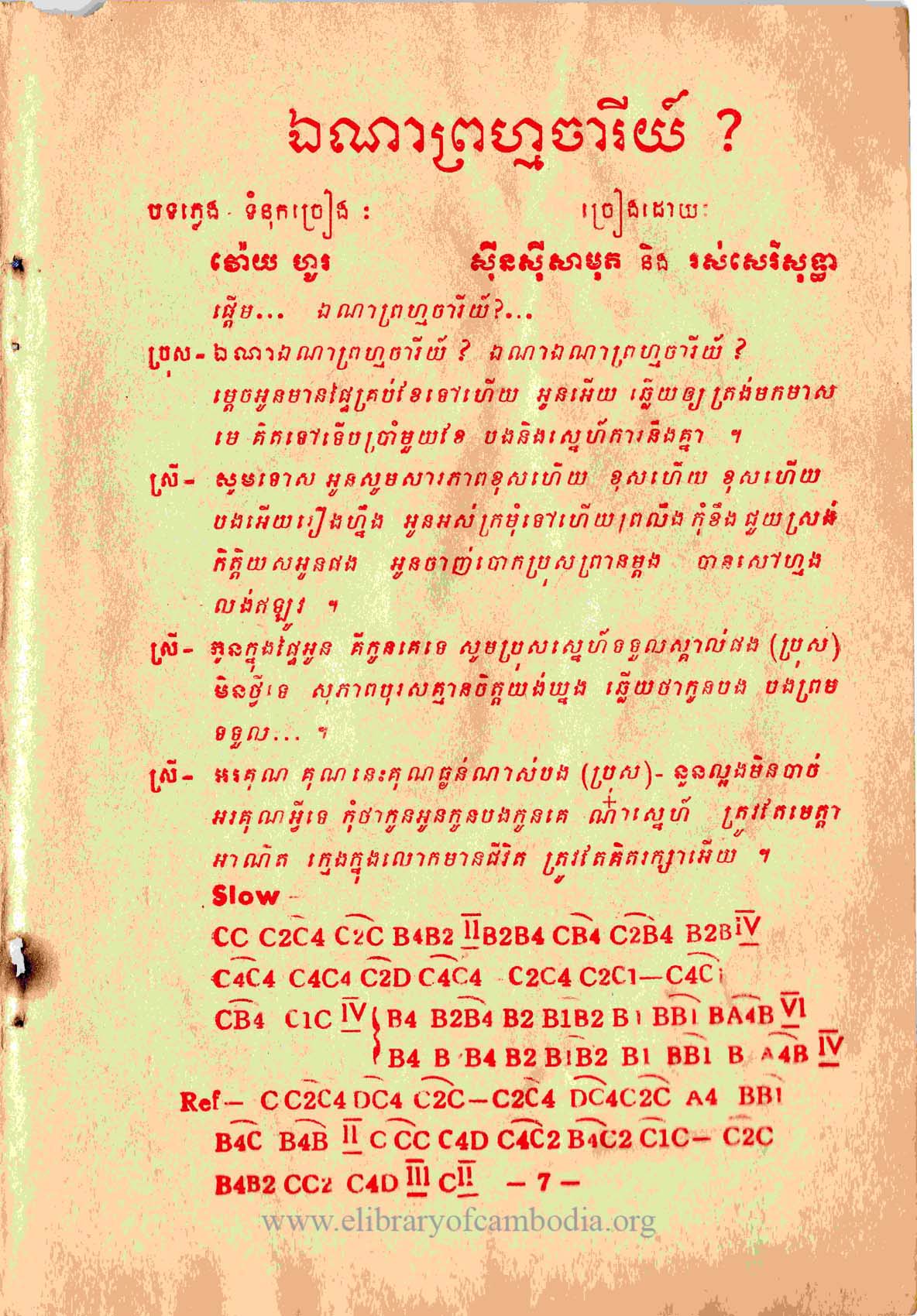 • ឯណាព្រហ្មចារី ជាបទចម្រៀងមួយបទដែលច្រៀងមុនថ្ងៃ ១៧ មេសា ១៩៧៥ ច្រៀងដំបូងដោយ ស៊ីន ស៊ីសាមុត  និង  រស់ សេរីសុទ្ធា